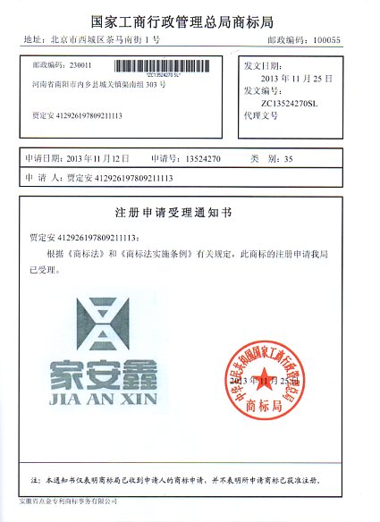 第35类“家安鑫JIAANXIN”商标受理通知书