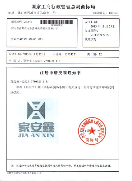 第32类“家安鑫JIA AN XIN”商标受理通知书