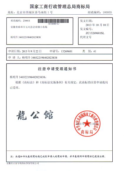 第41类“龙公馆”商标受理通知书
