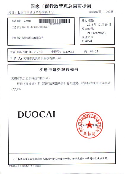第25类“DUOCAI”商标受理通知书