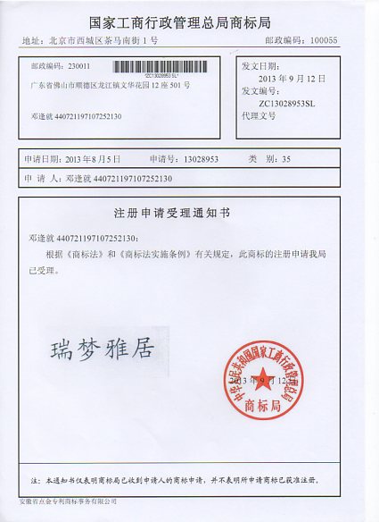 第35类“瑞梦雅居”商标受理通知书