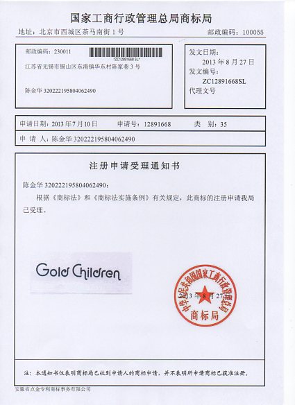 第35类“Gold children”商标受理通知书