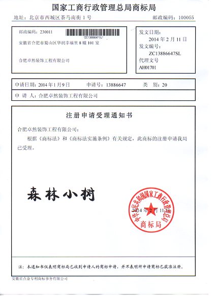 第20类“森林小树”商标受理通知书