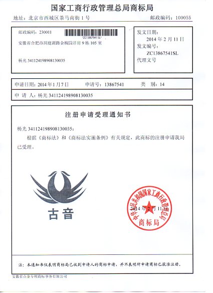 第14类“古音图形商标”商标受理通知书