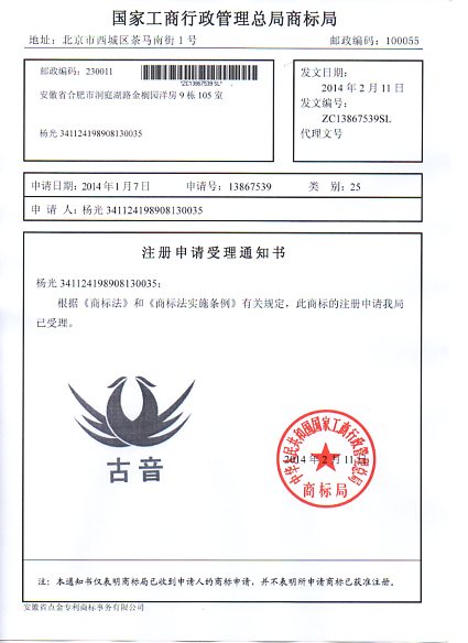 第25类“古音图形商标”商标受理通知书