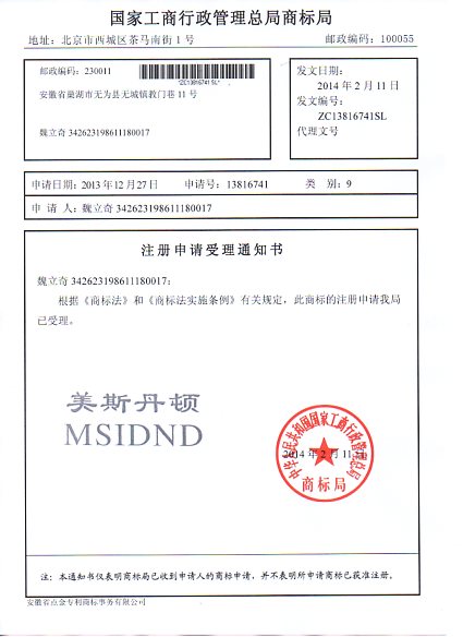 第09类“美斯丹顿MSIDND”商标受理通知书