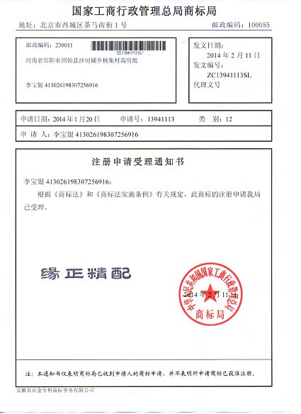 第12类“缘正精配”商标受理通知书