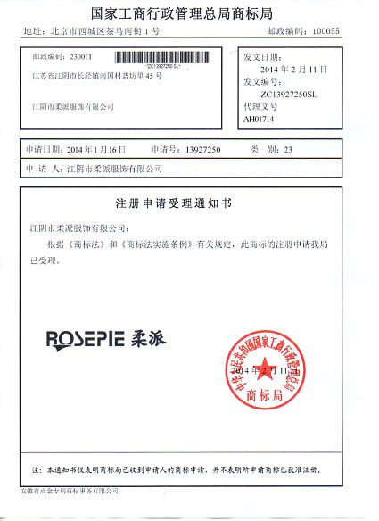 第23类“柔派”商标受理通知书
