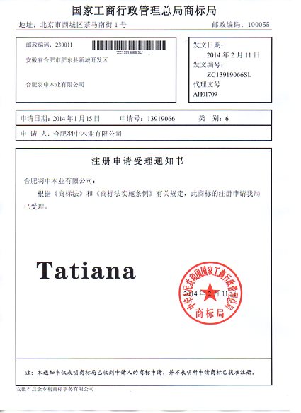 第6类“Tatiana”商标受理通知书