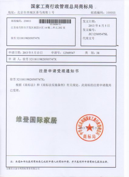 第38类“维登国际家居”商标受理通知书