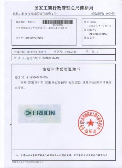 第07类“VERDON”商标受理通知书