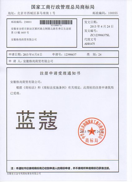 第24类“蓝蔻”商标受理通知书