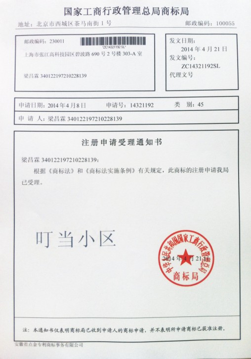 第45类“叮当小区”商标受理通知书