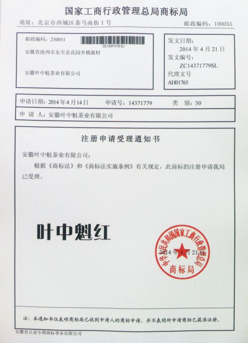 第30类“叶中魁红”商标受理通知书