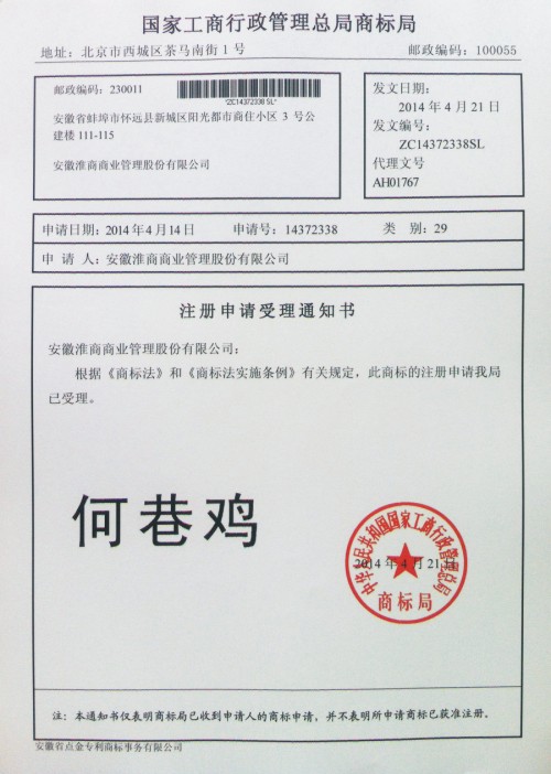 第29类“何巷鸡”商标受理通知书