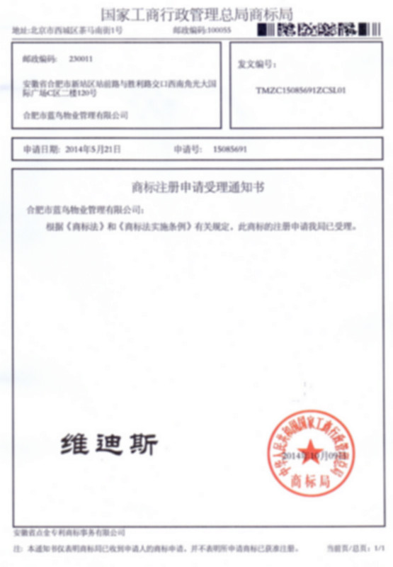 第41类“维迪斯”商标受理通知书