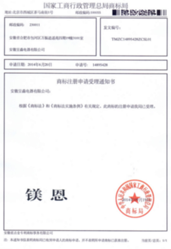 第11类“镁恩”商标受理通知