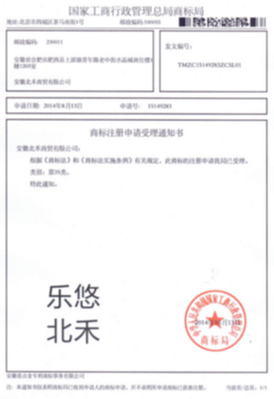 第35类“乐悠北禾”商标受理通知书