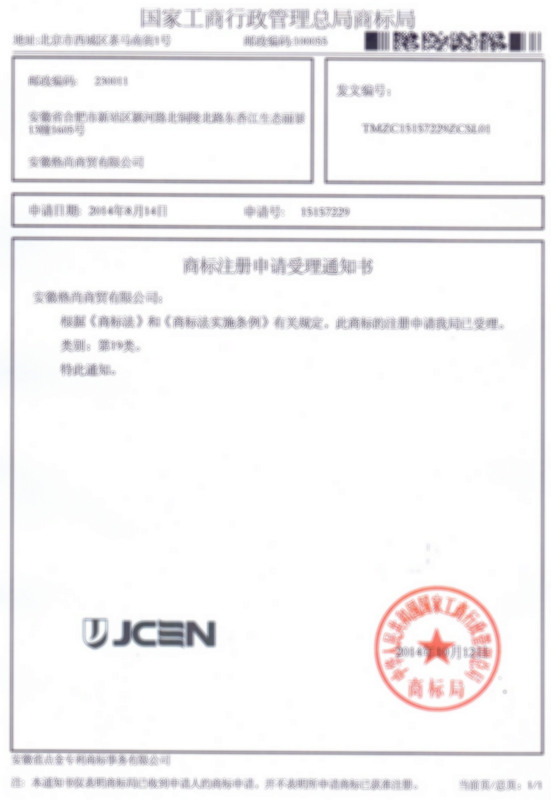 第19类“V JCEN”商标受理通知书