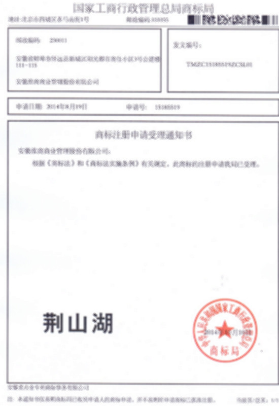 第29类“荆山湖”商标受理通知书