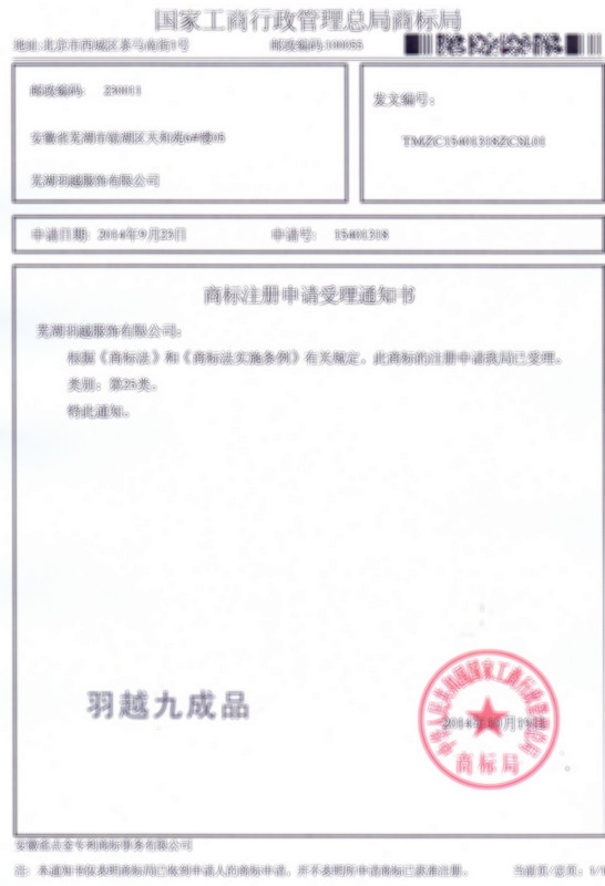 第25类“羽越九成品”商标受理通知书