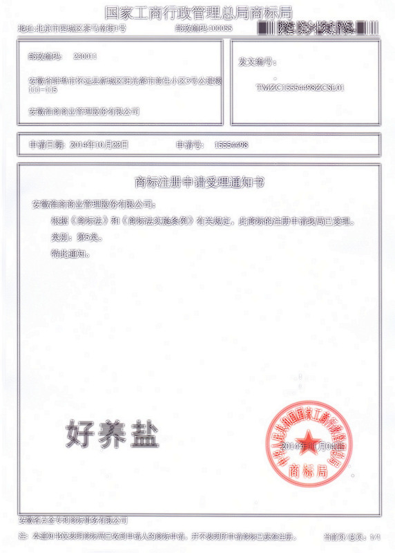 第5类“好养盐”商标受理通知书