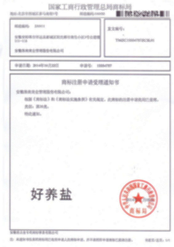 第35类“好养盐”商标受理通知书