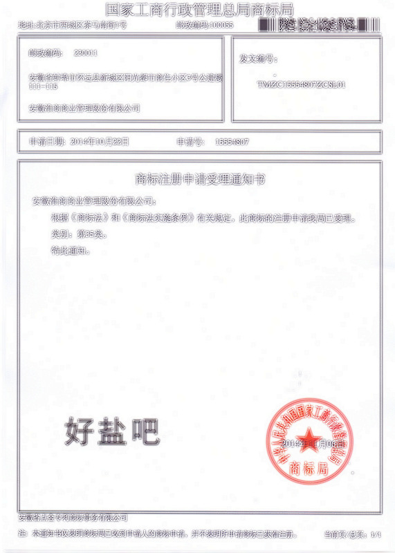 第35类“好盐吧”商标受理通知书
