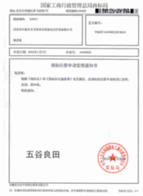 第30类“五谷良田”商标受理通知书