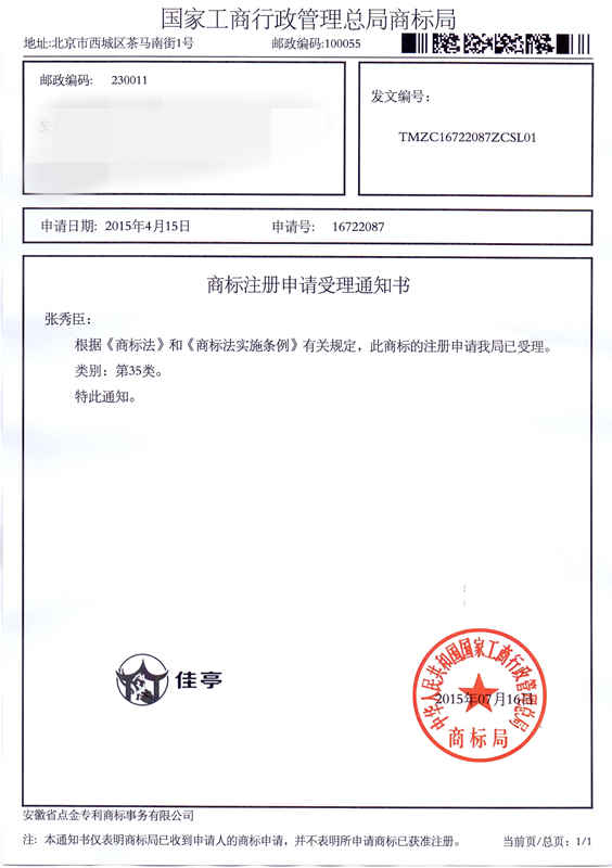 第35类“佳亭”商标受理通知书