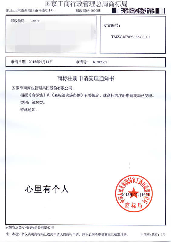 第30类“心里有个人”商标受理通知书