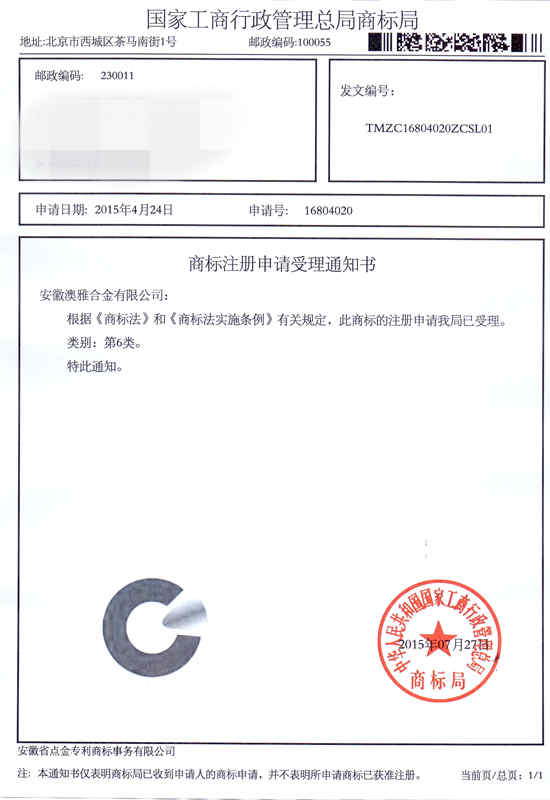 第6类“图形商标”商标受理通知书