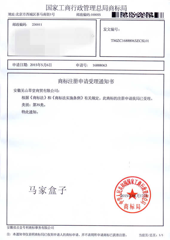 第35类“马家盒子”商标受理通知书