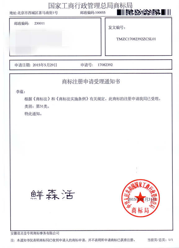 第31类“鲜森活”商标受理通知书