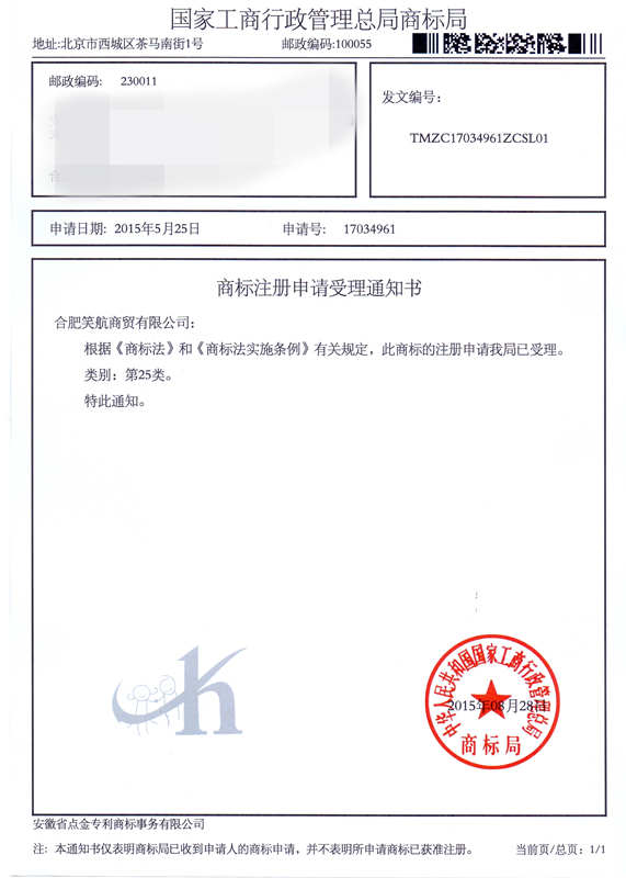 第25类“h”商标受理通知书