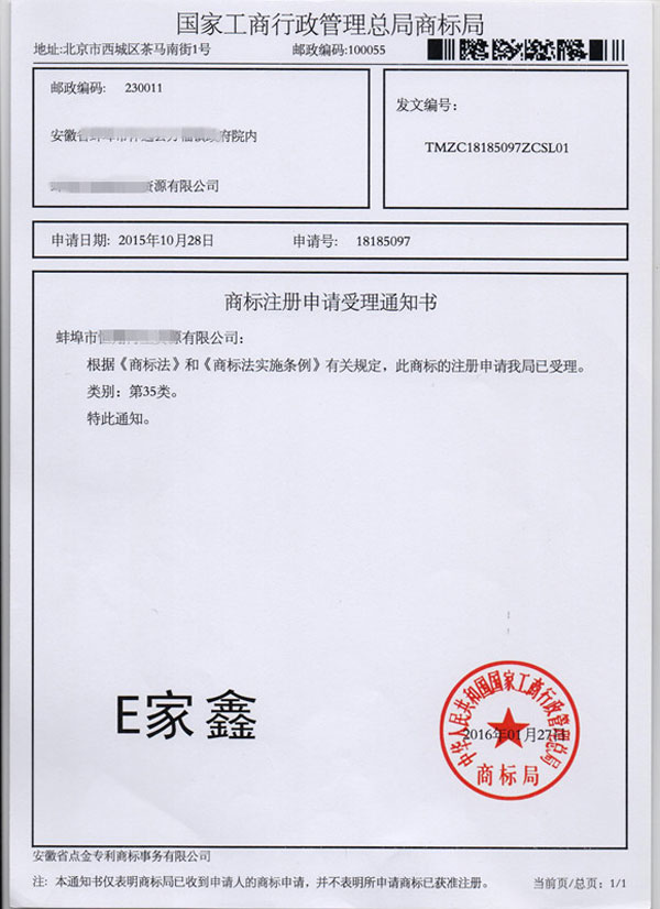 第35类“E家鑫”商标受理通知书