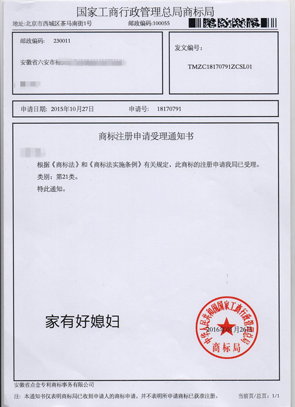 第21类“家有好媳妇”商标受理通知书