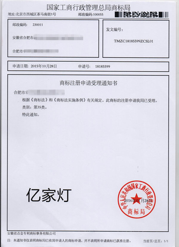 第35类“亿家灯”商标受理通知书