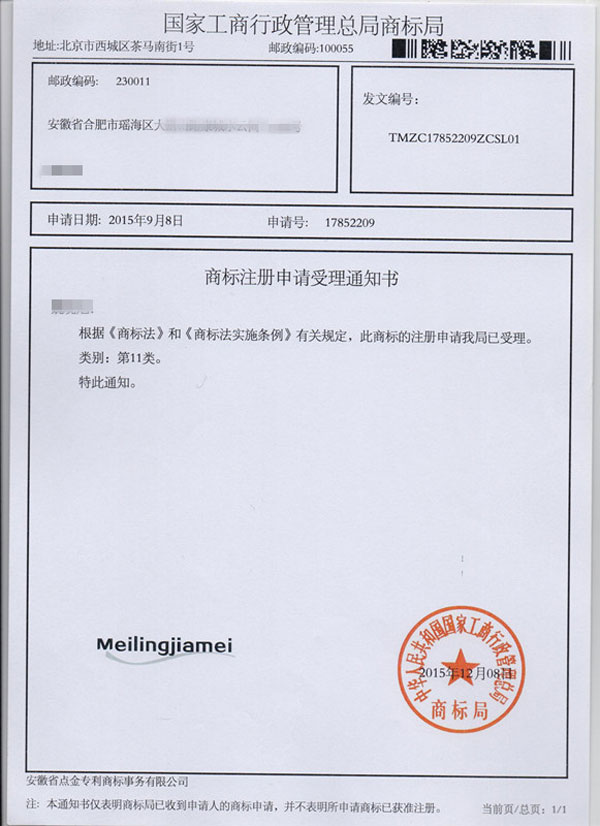 第11类“Meilingjiamei”商标受理通知书