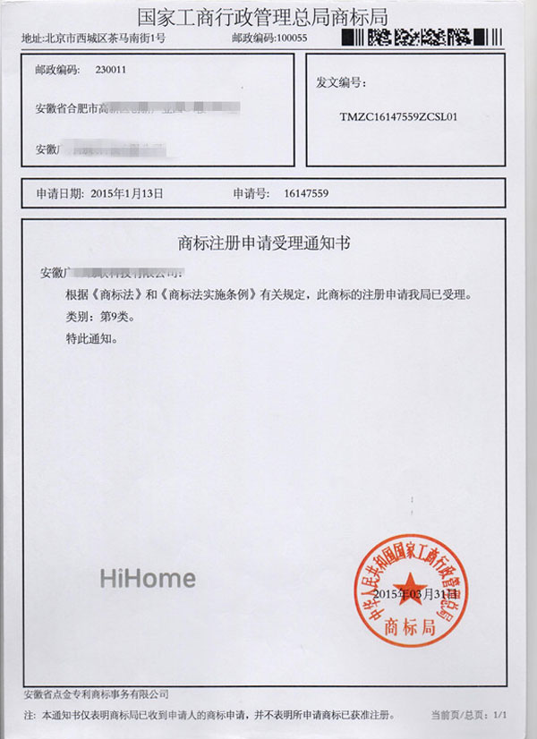 第9类“HIHOME”商标受理通知书