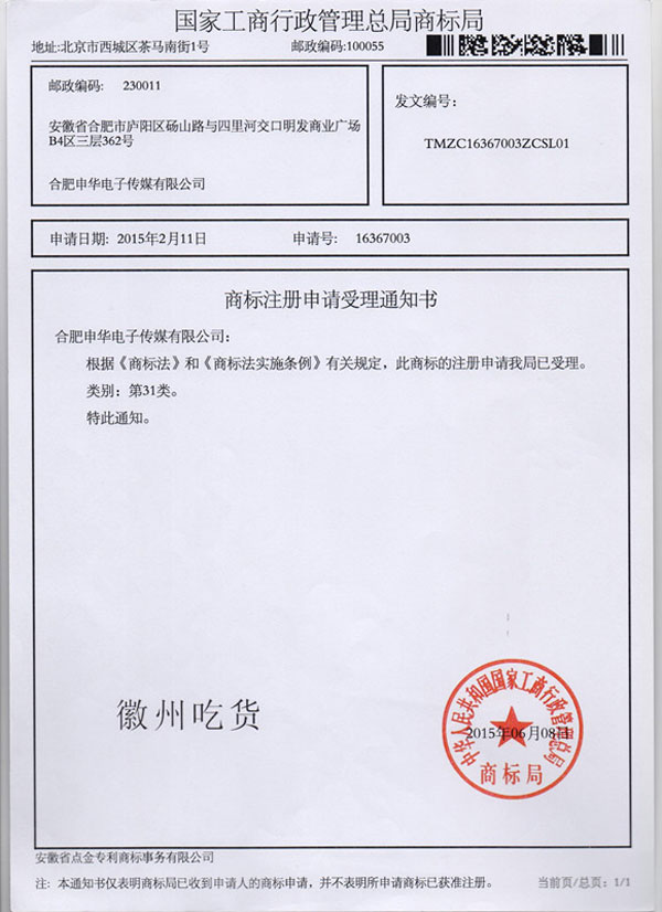第31类“徽州吃货”商标受理通知书