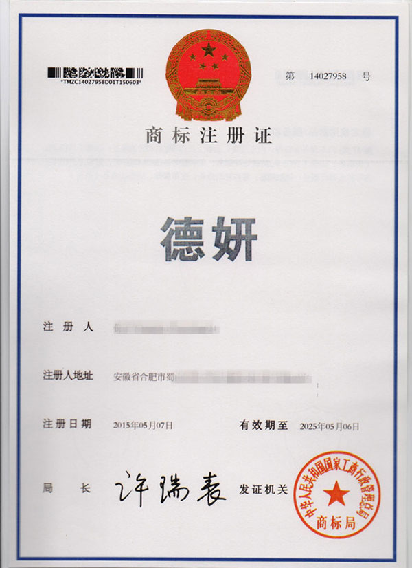 第37类“德妍”商标注册证