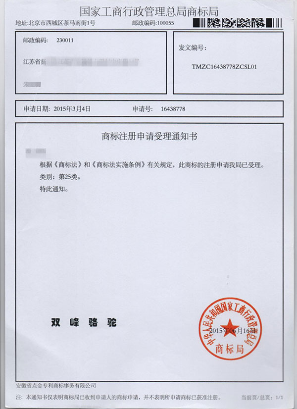 第25类“双峰骆驼”商标受理通知书