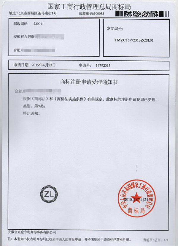第9类“ZL”及图形商标受理通知书
