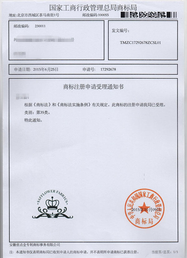 第35类“SAFFLOWER FABRICS”及图形商标受理通知书