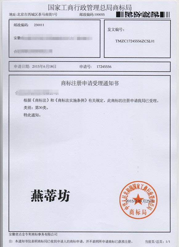 第30类“燕蒂坊”商标受理通知书