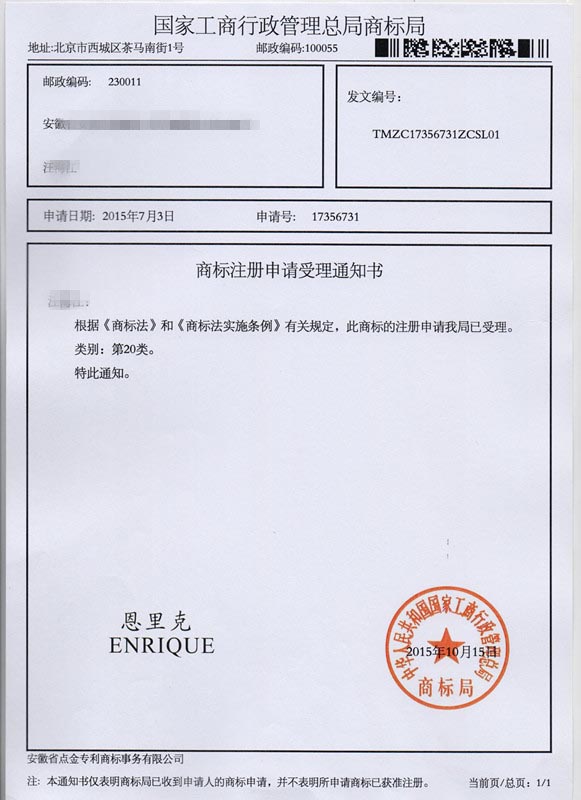 第20类“恩里克 ENRIQUE”商标受理通知书