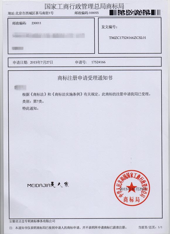 第7类“美大家 MEIDAJIA”商标受理通知书