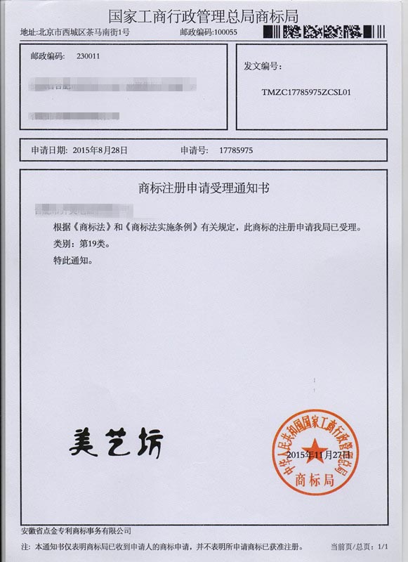 第19“美艺坊”商标受理通知书