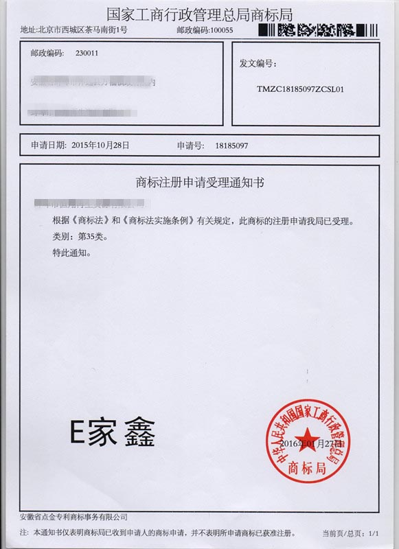 第35类“E家鑫”商标受理通知书